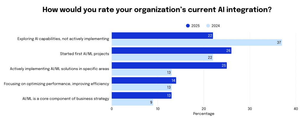 Hiện tại, 25% người tham gia khảo sát cho biết họ đang tích cực triển khai giải pháp AI, tăng mạnh so với 13% vào năm 2024.