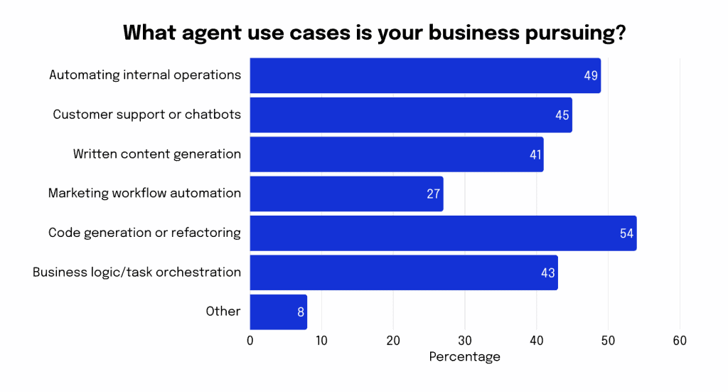 Khi được hỏi về các trường hợp sử dụng AI agents mà họ đang theo đuổi, 54% người tham gia khảo sát cho biết ưu tiên hàng đầu của họ là tạo sinh và tái cấu trúc mã nguồn (code generation/refactoring).