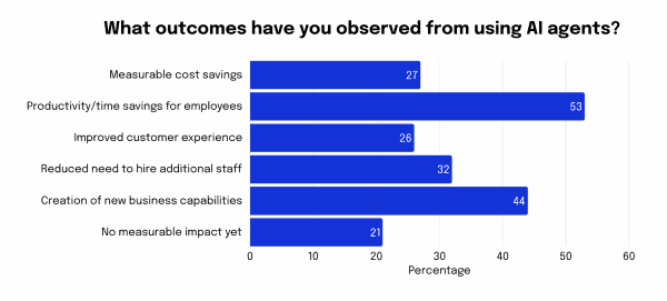 Việc không thử nghiệm và triển khai AI agents cũng có thể khiến doanh nghiệp bỏ lỡ những cơ hội đáng kể. Theo 32% người tham gia khảo sát, một trong những lợi ích nổi bật khi sử dụng AI agents là giảm nhu cầu tuyển dụng thêm nhân sự nhờ khả năng tự động hóa công việc.