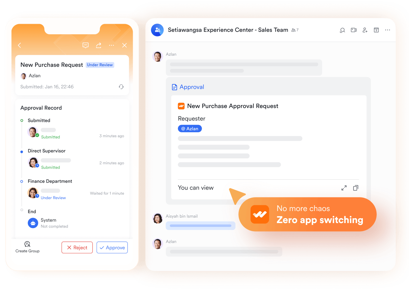 Trong quá trình phê duyệt, người dùng có thể khởi tạo group chat để trao đổi nhanh, đồng thời dữ liệu phê duyệt có thể tự động đồng bộ sang các hệ thống liên quan. Nhờ đó, mọi thông tin, ngữ cảnh và quyết định đều được tập trung tại một nơi, giảm thiểu việc chuyển đổi ứng dụng và hạn chế sai sót.